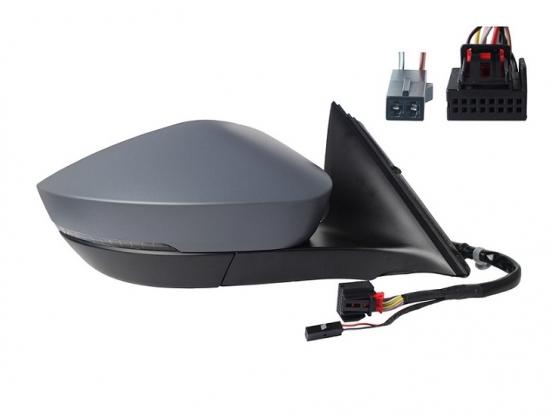 Complet, avec coque à peindre à la couleur du véhicule, glace convexe, feu clignotant LED et feu de courtoisie (éclairage du sol). Réglage intérieur électrique, dégivrant, rabattable électriquement avec détecteur d'angle mort (side assist), mémoire et 3 connecteurs 2, 13 et 17 fiches.