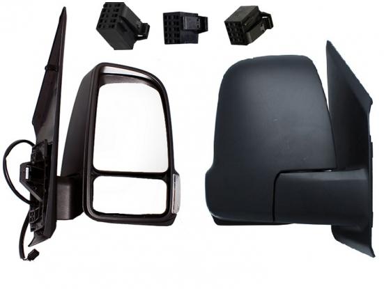 Complet, avec coque noire, glace supérieure convexe chauffante, glace inférieure angle mort chauffante et feu clignotant pour lampe WY16W. Réglage intérieur électrique, dégivrant, rabattable électriquement avec 3 connecteurs 2,3 et 5 fiches. Bras court.