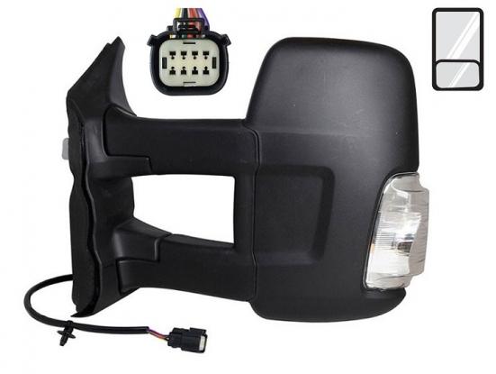 Complet, coque noire avec 1 glace convexe + 1 glace angle mort et feu clignotant orange 16 watts. Réglage intérieur électrique, dégivrant, rabattable manuellement avec connecteur 6 fiches. Bras long.