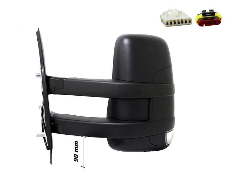 Complet, bras long avec coque noire, glace supérieure convexe, glace inférieure angle mort et feu clignotant orange 16w. Réglage intérieur électrique, dégivrant, rabattable manuellement avec sonde de température extérieure et connecteur 11 fiches.